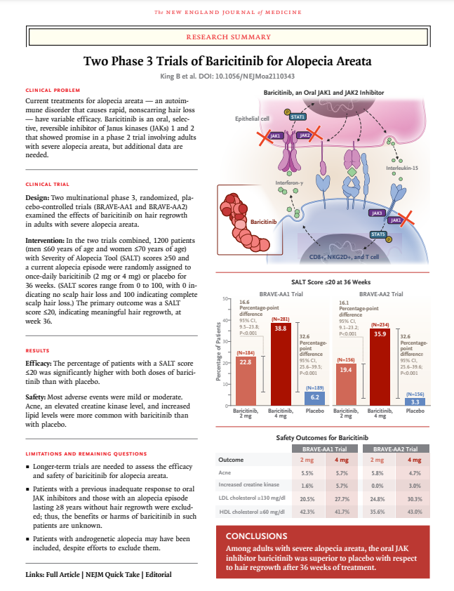 Citation: King B, Ohyama M, Kwon O, Zlotogorski A, Ko J, Mesinkovska NA, Hordinsky M, Dutronc Y, Wu WS, McCollam J, Chiasserini C, Yu G, Stanley S, Holzwarth K, DeLozier AM, Sinclair R; BRAVE-AA Investigators. Two Phase 3 Trials of Baricitinib for Alopecia Areata. N Engl J Med. 2022 May 5;386(18):1687-1699. doi: 10.1056/NEJMoa2110343. Epub 2022 Mar 26. PMID: 35334197.